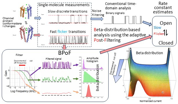 The function of proteins, including ion channels, is governed by conformational dynamics that span a vast range of timescales. Although single-channel recording is a powerful technique for observing discrete transitions between open and closed states (Figure, upper trace), its temporal resolution is finite. Extremely rapid gating transitions that exceed this limit are not resolved as individual events, but instead manifest as “flicker,” a noise-like current fluctuation (Fig., lower trace). Conventional time-domain analysis methods cannot extract kinetic information from such flickers, leaving the critical aspect of channel dynamics inaccessible.