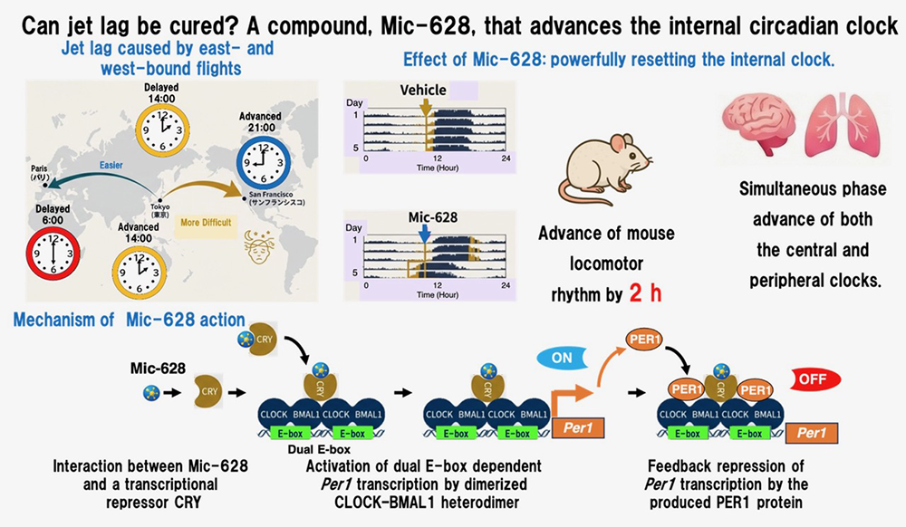 We have discovered a novel compound, “Mic-628,” that specifically induces the expression of the mammalian clock gene Per1. When Mic-628 was administered to mice, both the central (brain) and peripheral circadian clocks advanced simultaneously regardless of the timing of administration. This significantly shortened the recovery period from jet lag from the usual 7 days to just 4 days.Mechanistically, Mic-628 directly binds to the transcriptional repressor CRY1, promoting its interaction with the clock protein complex (CLOCK-BMAL1). We found that this combined complex acts on a genetic switch known as the “double E-box sequence” to specifically turn on Per1 transcription. Furthermore, mathematical modeling revealed that the “auto-inhibitory mechanism” exerted by the newly induced PER1 protein itself is responsible for this stable, time-independent clock-advancing effect. These findings not only deepen our understanding of the fundamental operating principles of the circadian clock but are also expected to lead to the development of innovative therapeutics for circadian rhythm sleep disorders. As a “smart drug,” Mic-628 uniquely and consistently advances the clock regardless of when it is taken.